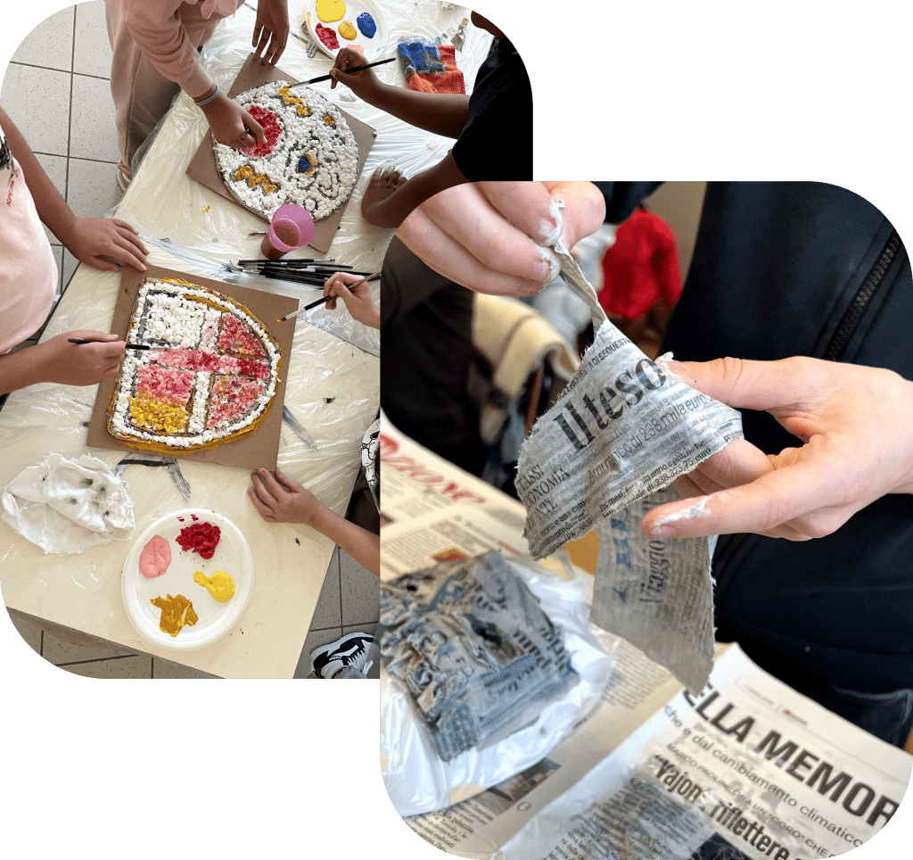 Nel laboratorio di cartapesta e pittura della scuola primaria il tempo rallenta e le mani imparano ad aspettare. Carta e colla si intrecciano sugli stampi, tra sguardi concentrati e gesti condivisi. Poi arriva il colore, che accende emozioni e trasforma ogni forma in qualcosa di unico. Materiali semplici diventano arte, e ogni bambino lascia un segno personale in un’opera collettiva, scoprendo la bellezza della collaborazione, della cura e della creatività che unisce.